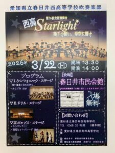 春日井西高校の吹奏楽部の生徒さんから、今年もコンサートのチラシをいただきました。